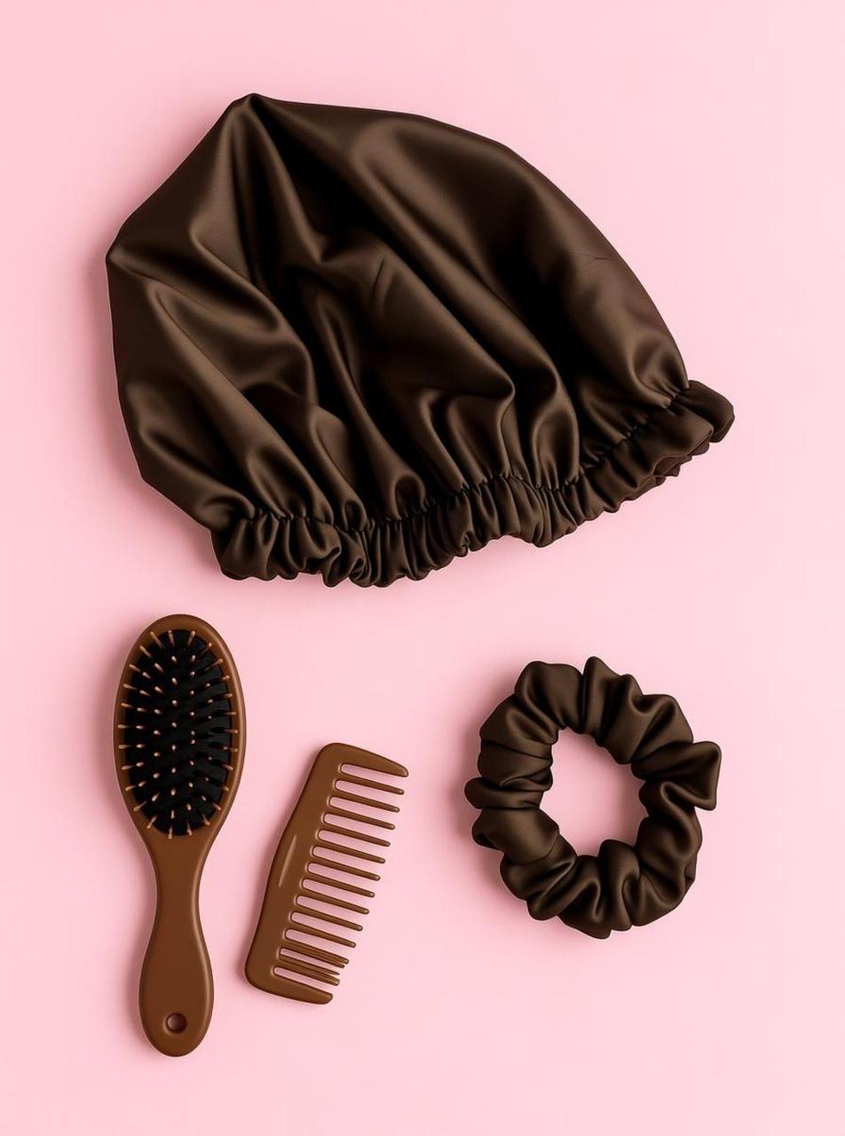 Czepek chroni włosy przed tarciem i puszeniem podczas snu, a mini gumka pozwala na delikatne upięcie bez łamania i odgnieceń.