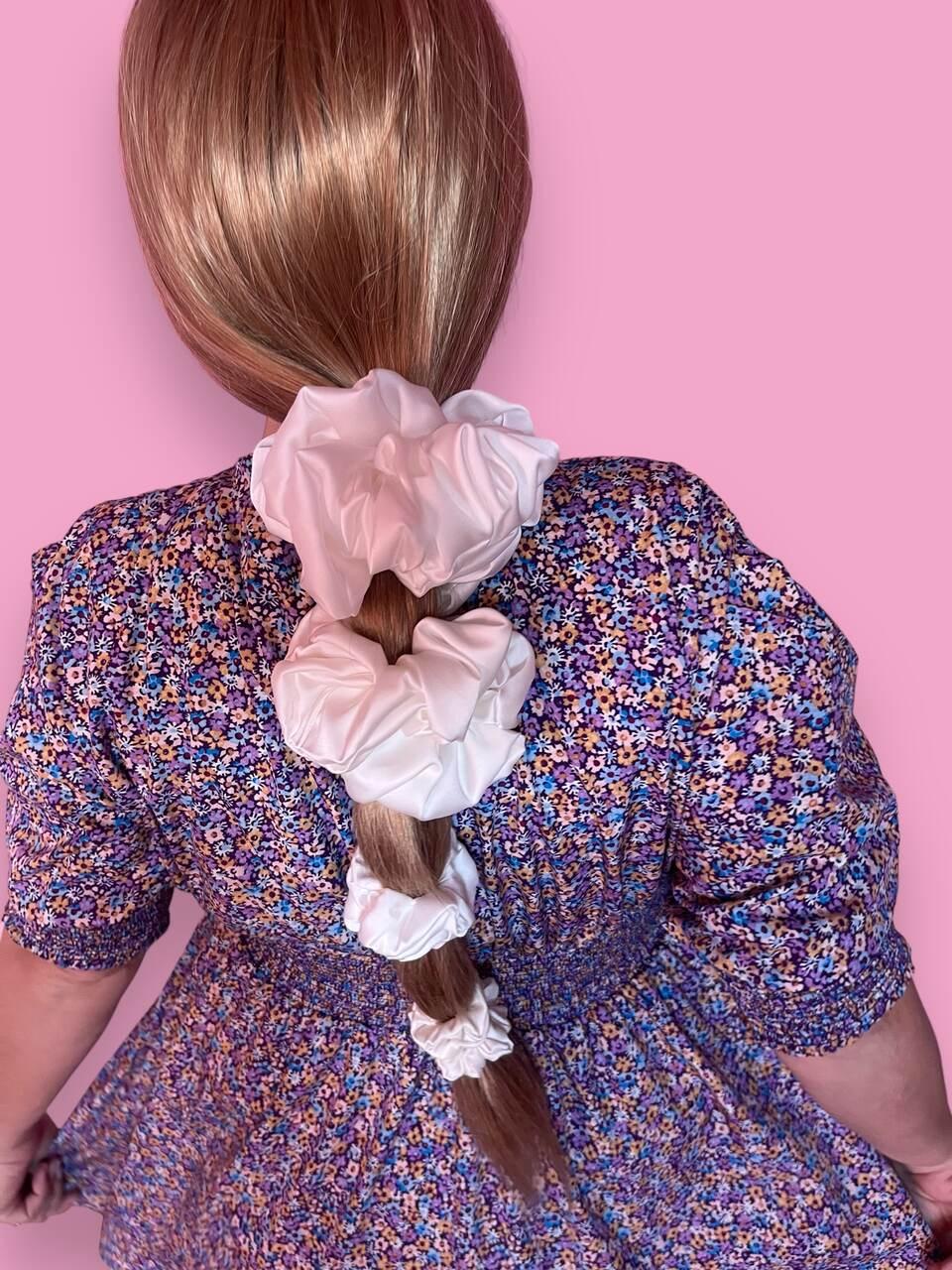 2. MINI – Ta mała gumka do włosów o rozmiarze mini jest idealna do zrobienia małych kucyków, kitki czy upięć na przykład z boków głowy. Dzięki swojej niewielkiej formie doskonale trzyma włosy, nie pozostawiając śladów ani niewygodnego ucisku. Doskonała do codziennego użytku i idealna do szybkich, casualowych stylizacji. Średnica gumki to 9 cm. Szerokość materiału to 2 cm. Gumką standardowo można przewiązać włosy 2-3 razy. Skład materiału to satyna poliestrowa z dodatkiem jedwabiu